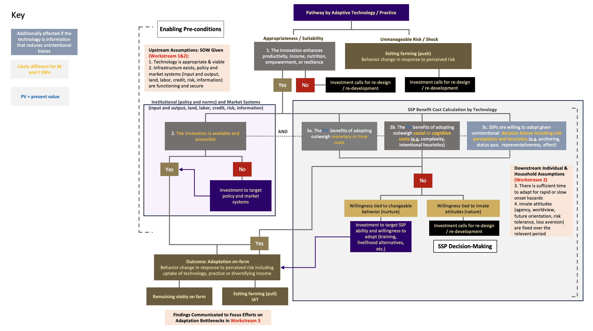 Figure 1 depicts a stylized decision tree articulating the assumptions and conditions under which successful SSP adaptation might occur; that the technology, practice or income diversification options are viable and risk is manageable, that adequate digital, physical and information infrastructure is in place and that market and policy systems are functioning. If those conditions hold to some extent, then uptake would be expected if SSP perceptions of benefit-cost, or risk-return are positive—unless, that is, psychological, social, or behavioral factors influence SSP decision-making away from the economically optimal choice. Each of CRIFS’ three workstreams addresses a section of the decision tree.